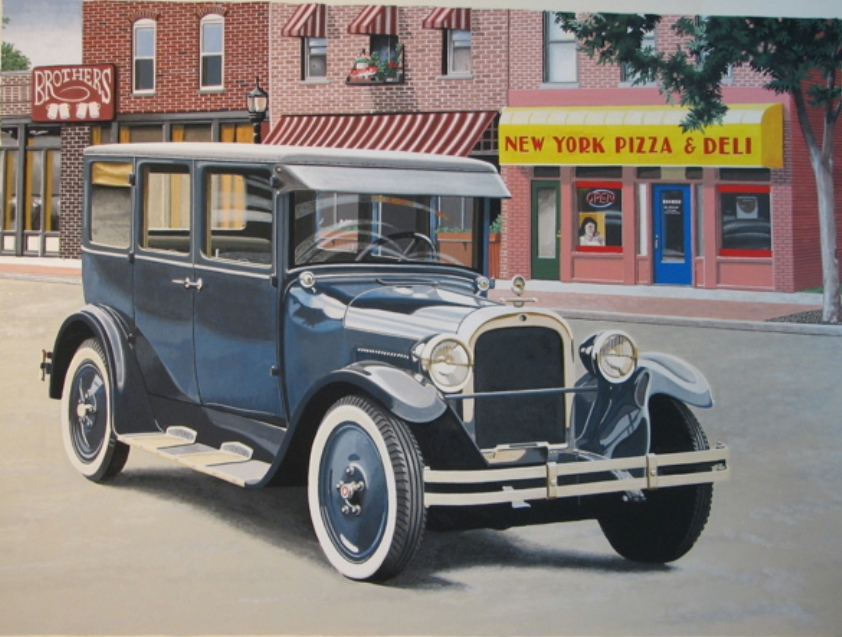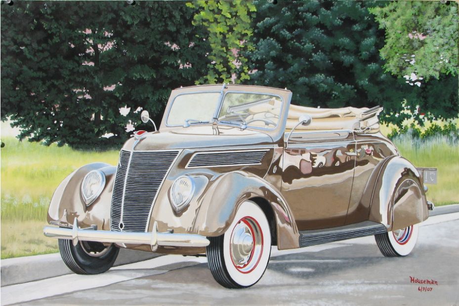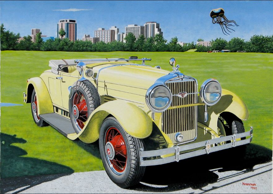 <><> A fully restored classic auto is surely a work of art. John Houseman is one who has always appreciated this fact. A skilled painter, John found an elegant duesenberg dual-cowl phaeton, or a bullet-like talbot lago, to be irresistable subject matter. <> His principal medium is gouache - a water based paint that comes in a tube, and is mixed to a consistency of tempera paint. Its opaque, matte finish makes it an ideal material for rendering the beautiful machines we all have come to admire. It is applied to an acid free museum board, which will last for decades, if not centuries, retaining its brilliance from the moment the signature is applied. Francisco de Goya used gouache in the 18th century, and his works stand today, as a testament to the permanance of the medium. Please visit the web pages, www.adirondackartists.com/houseman.html, or http://john-houseman.artistwebsites.com/. There you will find a collection of some of the beautiful works he has completed since the early 80s. When you decide to commission a painting of your cherished automobile, or wish to give a beautiful, personal gift to a collector or enthusiast, you may phone John at 715-839-7527. address: John Houseman 2122
